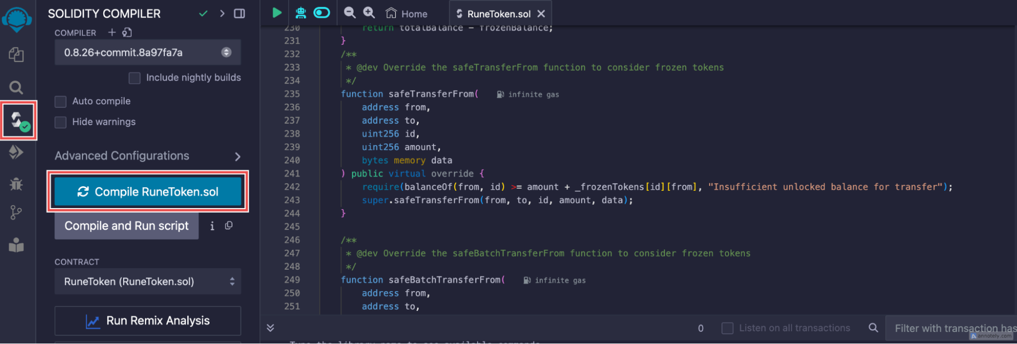 0.8.26. If not, select the correct version from the dropdown menu. - Click on the Compile RuneToken.sol button. A green check icon inside a circle will appear, indicating that the compilation was successful.